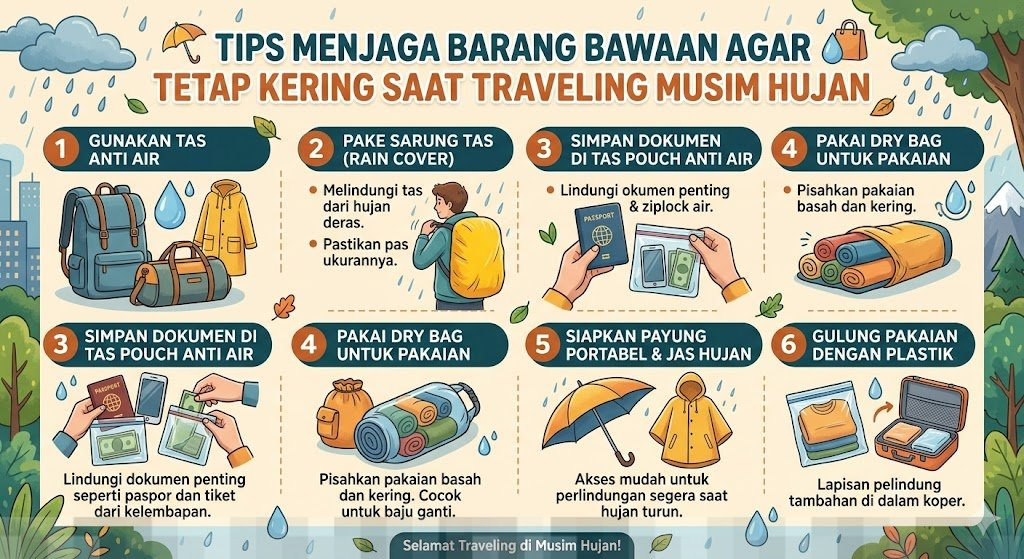 Menjaga barang bawaan tetap kering saat traveling di musim hujan memang memerlukan perhatian lebih, tetapi dengan persiapan yang tepat, Anda dapat menghindari berbagai masalah yang disebabkan oleh cuaca buruk. Terapkan langkah-langkah di atas, dan pastikan untuk selalu memeriksa kondisi cuaca sebelum berangkat. Dengan cara ini, Anda dapat menikmati perjalanan dengan tenang dan fokus pada pengalaman yang berharga.